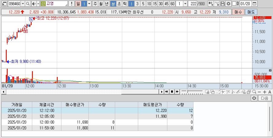 인공지능(AI) / 지능형로봇 테마의 1등주로 잘 매수하여 상한가까지 진입하였으나, 상한가에서 매수세가 불안하여 풀릴 것 같아서 모두 익절 하였으나, 결과적으로 고영은 한번도 상한이 안 풀리고 끝났다. 내일 갭상할 것 같은데 좀 아쉽다.