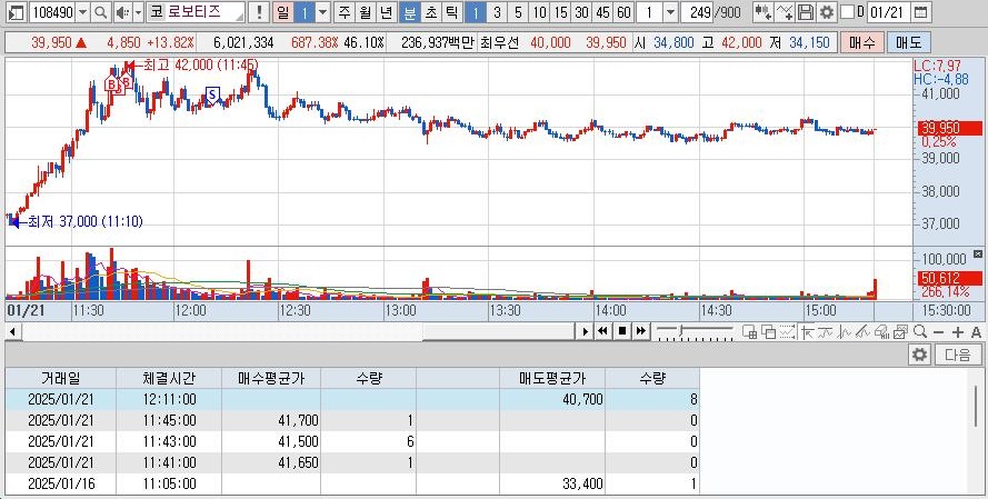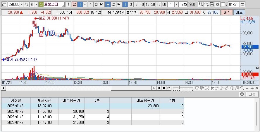 어제 상한가에서 매도한 종목으로 시초의 흐름이 좋아서 진입하였고 추가 상승하지 않아서 잘 손절하였다. 하지만 다시 상승하여 장 후반에 추가 매수하여 오버나잇으로 넘겼다.