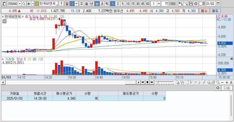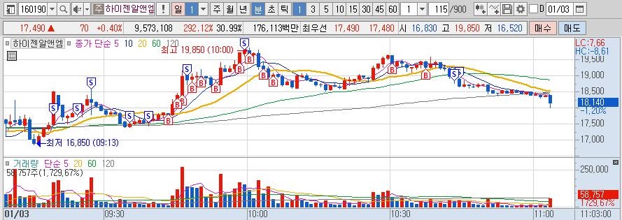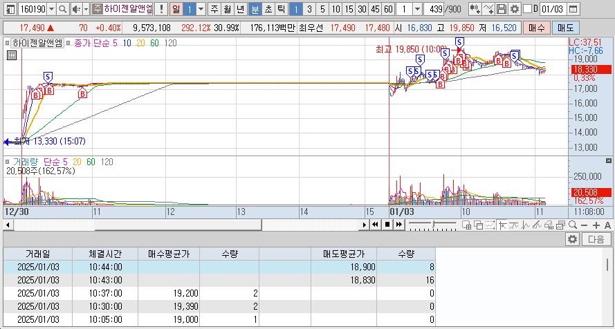 1/2에 상따하여 오버나잇한 하이젠알앤엠은 갭상은 아니지만, 9:17부터 상승하여 줄 때 먹자는 생각으로 부분 매도에 들어갔다.