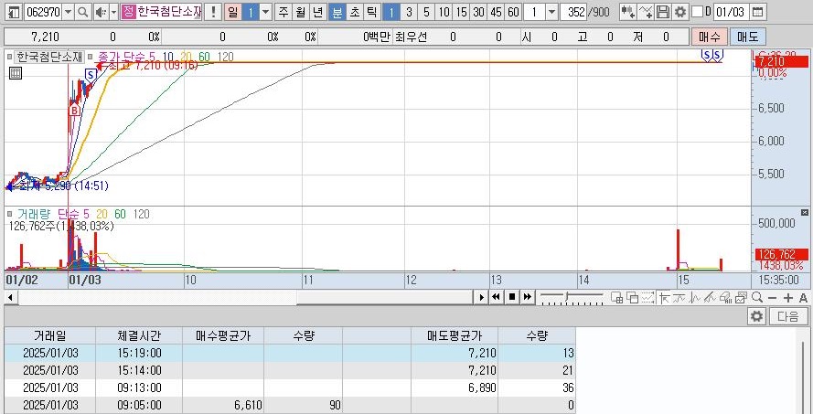 어제 미장에서 양자컴 테마가 상승하였고, 오늘도 국내 양자테마가 갈 것 같았다. 눈여겨보던 한국첨단소재를 장 초반에 진입해서 부분 익절하고 상한가 진입하였는데, 요즘은 상한가 종목이 다음날 갭하락하는 경우도 있어서 물량을 많이 줄여야겠다고 생각해서 장 막판에 대부분 매도하였다.