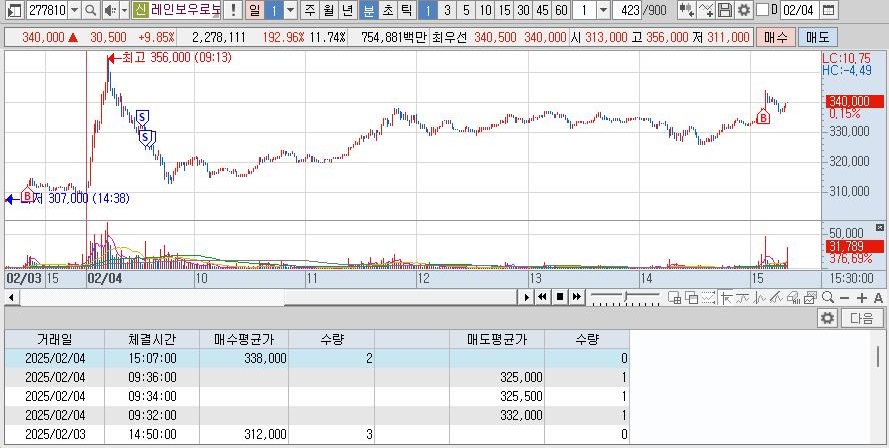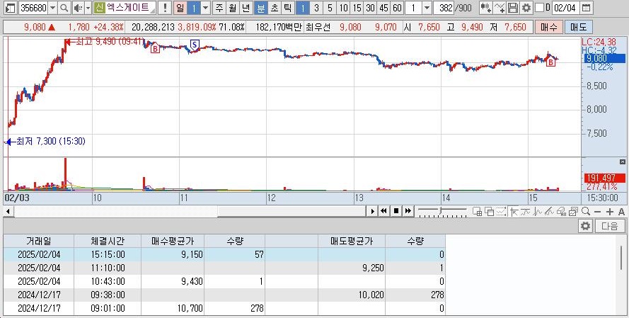 장초 최고점 부근에서는 팔지 못하였으나 수익은 가져갔다. 수급이 좋아서 오늘도 종베로 잡았다.